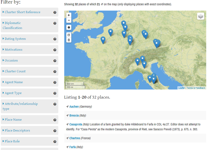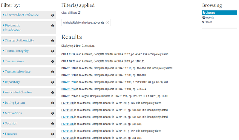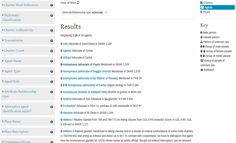 The ‘Charlemagne’s Europe’ database allows researchers to track the appearance and distribution of advocates across Western Europe between 768 and 814. Each of the three browse options – charter, agent, place – presents information in different ways. The charter browse screen offers the best means of analysing documentary and diplomatic contexts. For the present example, you could produce a list of charters including any individual named as an advocate by selecting ‘advocate’ from the ‘Attribute/relationship type’ facet (under the parent category ‘Secular offices & ranks’). Currently, there are 21 such charters in the database (from a total of 912 at the time of writing).