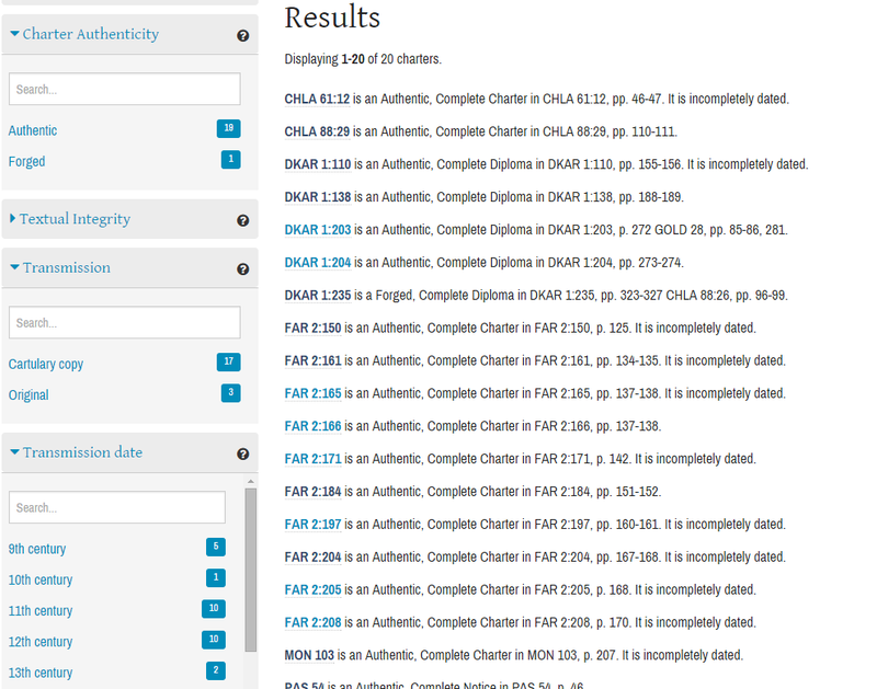 Browsing with either the ‘Attribute/relationship type’ or ‘Latin term’ facets yields some interesting information on documentary transmission. For instance, when applying the ‘Latin term’ facet, we can then see that, of our 20 charters containing an individual termed an advocatus, 17 are cartulary copies and just 3 are originals. Moreover, upon closer inspection, one of these originals (DKAR 1:235) is a later forgery, which we might wish to eliminate from our search by selecting ‘Authentic’ from the ‘Charter authenticity’ facet.
